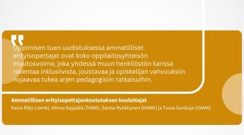 ammatillisen koulutuksen järjestäjät nostavat esille työpaikkaohjauksen merkityksen. Tänä vuonna palkinnon saa lähes 40 työpaikkaohjaajaa. Ammatilliseen koulutukseen sisältyy runsaasti työpaikalla tapahtuvaa oppimista. Onnistuneen työelämäjakson mahdollistamiseksi tarvitaan