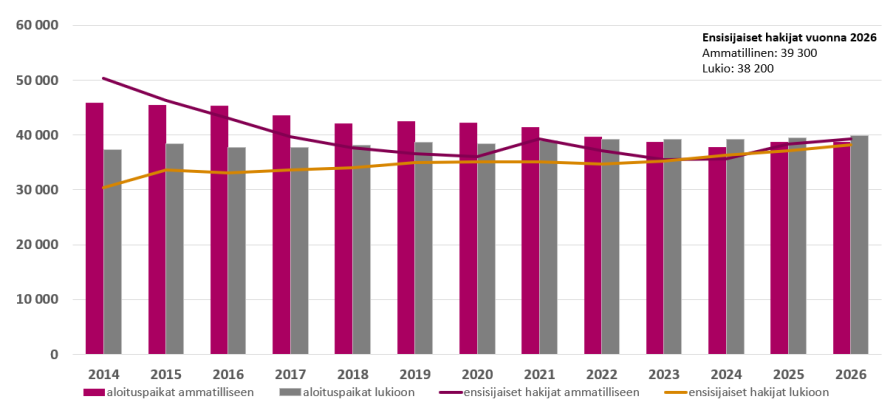 Tänä keväänä perusopetuksen päättää noin 63 900 nuorta. Yhteishakuun heistä osallistui noin 61 500. Ensisijaisesti ammatilliseen koulutukseen hakeneita oli 39 % ja lukioon 55 %. Noin kuusi prosenttia haki valmentaviin koulutuksiin ja kansanopistoihin. Ammatillisissa perustutkinnoissa ja lukioissa haettavana on yhteensä noin 78 700 aloituspaikkaa.